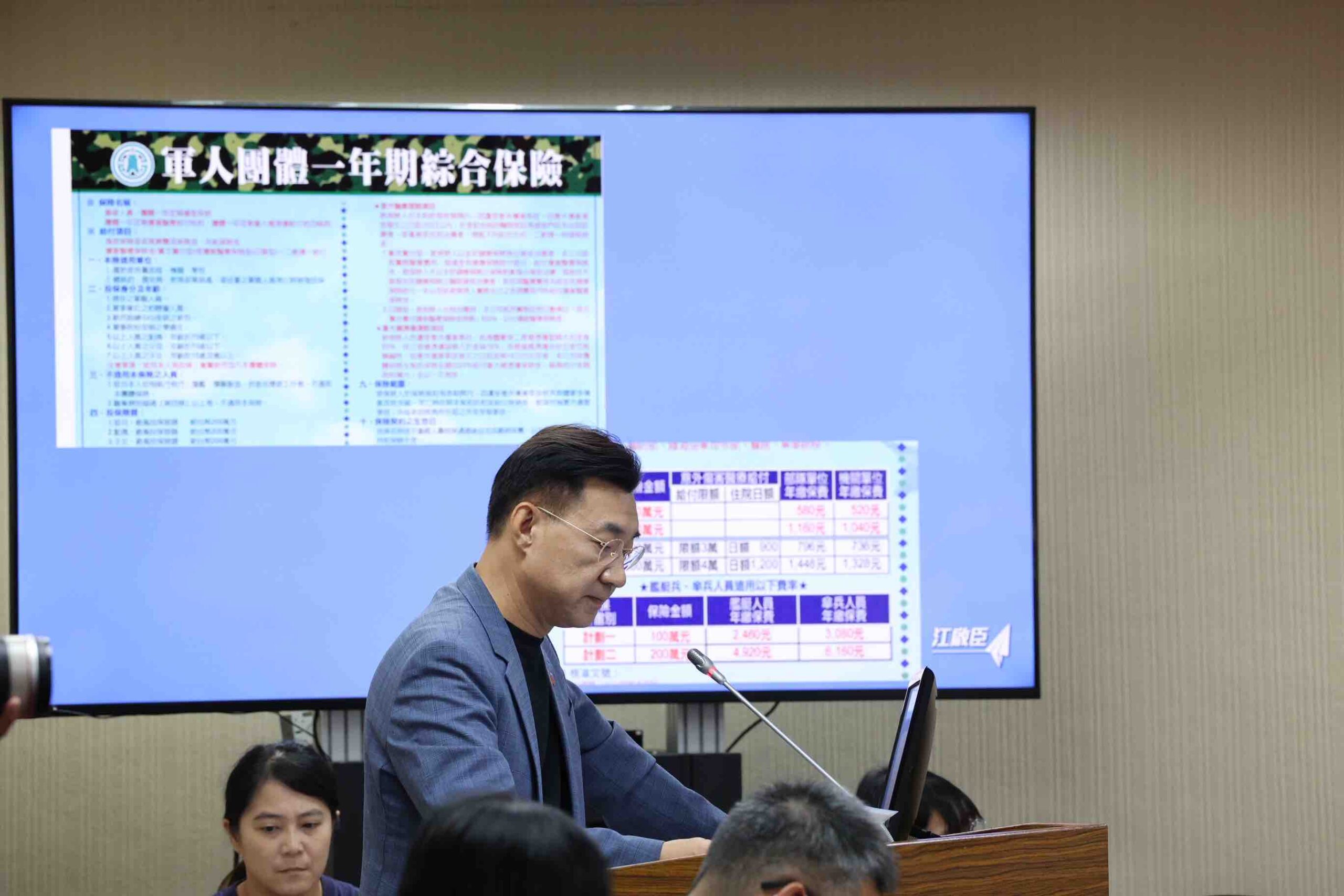 江啟臣委員又提到,例如軍友社與台銀人壽推出的保險,一年只要七百多,並不是很大的金額,國家起碼應該幫國軍保意外傷病的保險,現在軍人21.5萬,只要一億七千多萬的預算就可以照顧,江委員表示前述民間保險條款只是參考,希望國防部能找其他廠商研議出對國軍最好的照顧福利,邱部長則當場允諾會研議辦理。