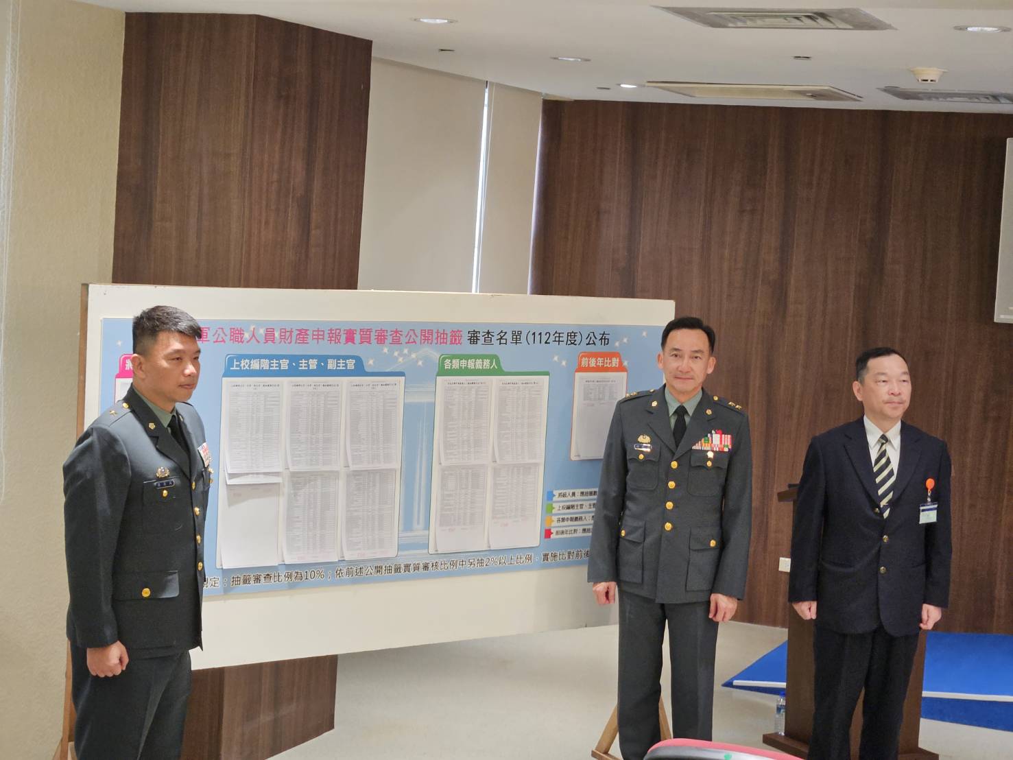 國防部依據「公職人員財產申報資料審核及查閱辦法」規定,於今(21)日公開奉辦「112年度公職人員財產申報實質審查抽籤記者會」,由國防部陸軍常務次長楊中將、總督察長李中將、政風室王主任、軍紀督察處處長吳少將及現場記者,透過電腦作業系統「隨機抽樣」,自全軍列管申報義務人3,137人中,抽出314人進行實質審查作業;並從314人中再抽出7人,實施前後年度申報資料比對,藉由公開公正之抽籤程序,落實行政透明。