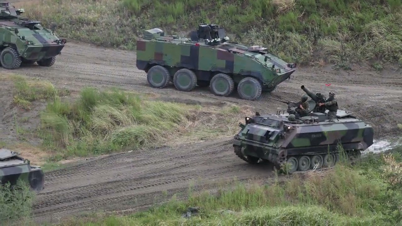 漢光演習進入第四天,今天是「聯合反登陸作戰操演」,於新北挖子尾地區執行,演習假定敵軍於桃園海灘、挖子尾海灘登陸,同時攻擊台北港作為下卸基地,成一個環狀兩棲攻擊,另外模擬敵軍特工小部隊從淡水河口向萬華地區挺進,海巡搭配演練攔截,以及前兩天憲兵裝憲營的模擬橋樑阻絕以及關鍵設施奪回演練。