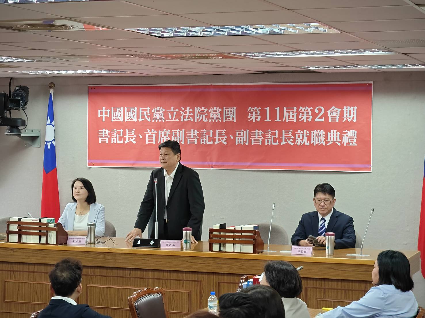 【軍傳媒/立法院】今(25)日國民黨黨團於立法院紅樓302舉行第11屆第2會期書記長、首席副書記長、副書記長就職典禮,由國民黨團總召傅崐萁主持典禮,民進黨黨團總召柯建銘、幹事長吳思瑤、書記長蔡易餘及民眾黨團總召黃國昌皆到場致意致詞。傅崐萁表示,非常感謝朝野各黨團都到場致意,國會是整個國家運作的一環,各個政黨都肩負民意、法律攻防及協商。本會期是總預算跟人事案,希望大家秉持民意,理性善意的溝通,成為人民跟政府之間的橋樑。
