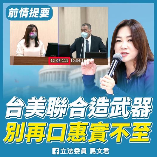 馬文君委員表示,其實早在2022年12月07日的國防外交委員會,她就對國防部長邱國正說過,借鏡俄烏戰爭的經驗來看,為了避免烏克蘭彈藥短缺的困境發生在台灣,因此國防部必須向美方爭取要求技術轉移。技術移轉對國防工業也是一大福音,軍購武器沒到貨、又不肯合作生產,請問要用什麼保護台灣,掃帚嗎?